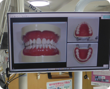 風景や歯科治療・用品等の映像を流して待ち時間の負担の軽減を工夫しています。設置したモニターにレントゲンや写真等を映し出し、画面を見ながら説明することができます。